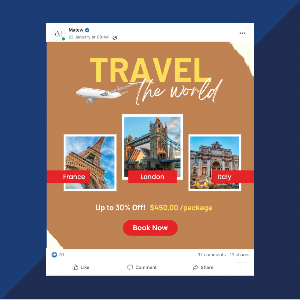 Facebook provides businesses with excellent opportunities that allow them to showcase their products from the best angles. Ads on this platform include both text and visual formats. You can boost your post by turning it into an ad, produce stories to show your behind-the-scenes, make a slideshow of your new collection, use carousel ads to demonstrate up to 10 products linking to the corresponding pages, etc.